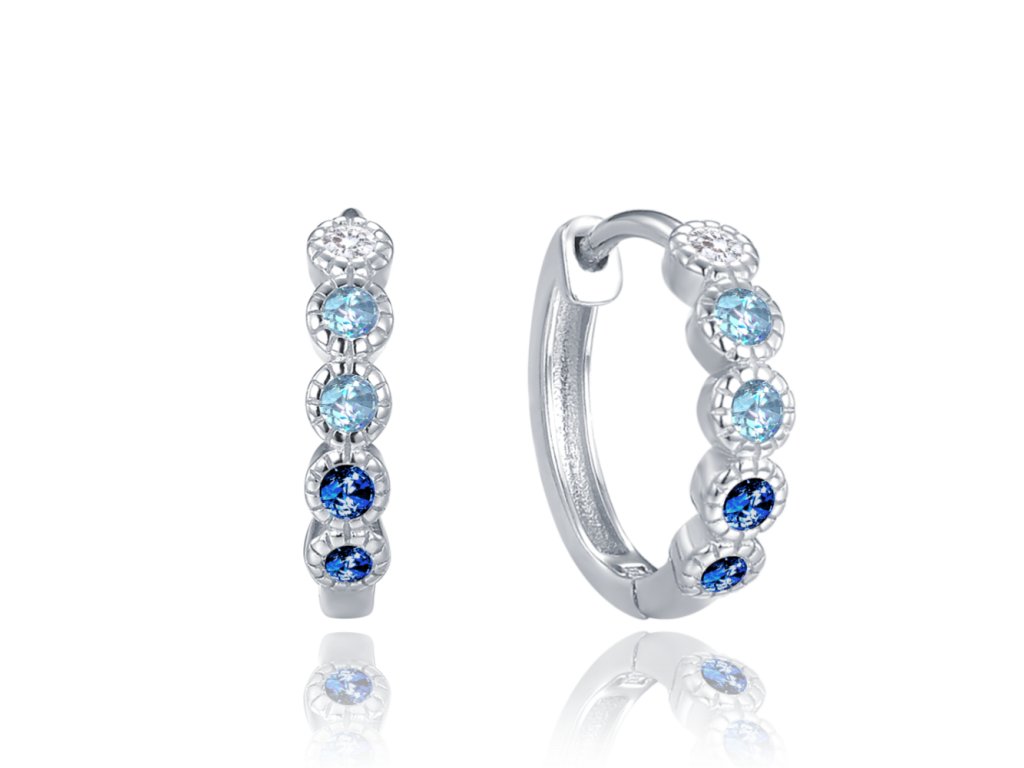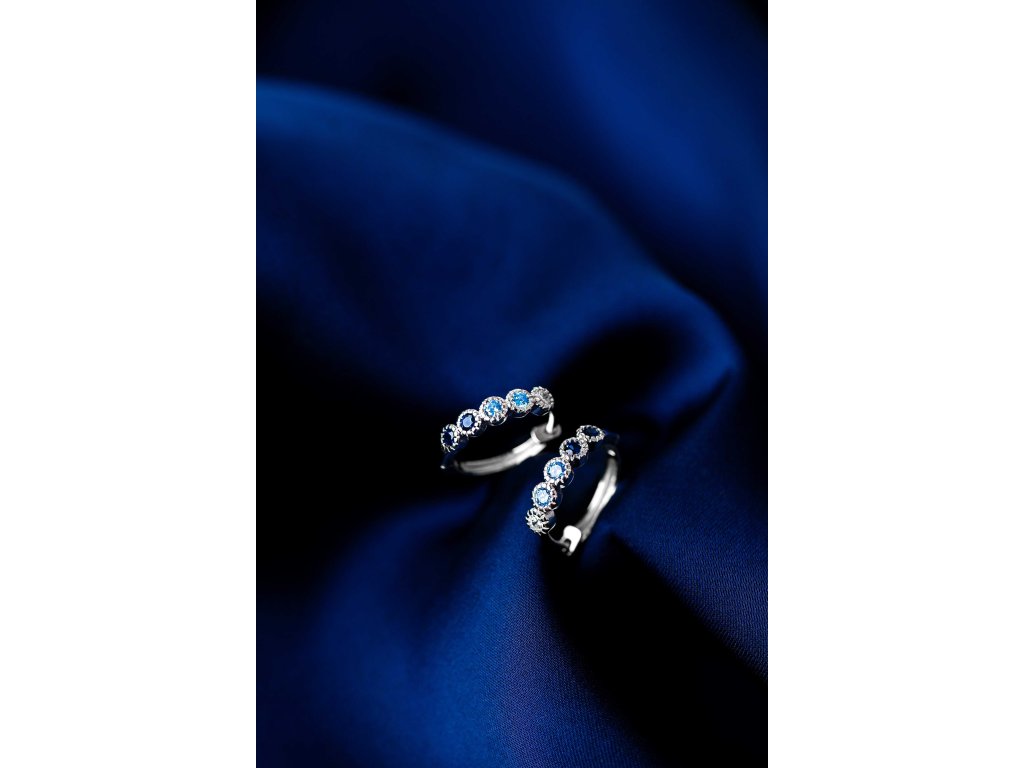 Náušnice mají průměr 14 mm a jejich přední část zdobí řada precizně zasazených zirkonů v modrých a bílých tónech. Hra světla a barev působí velmi jemně, přesto zaujme na první pohled.