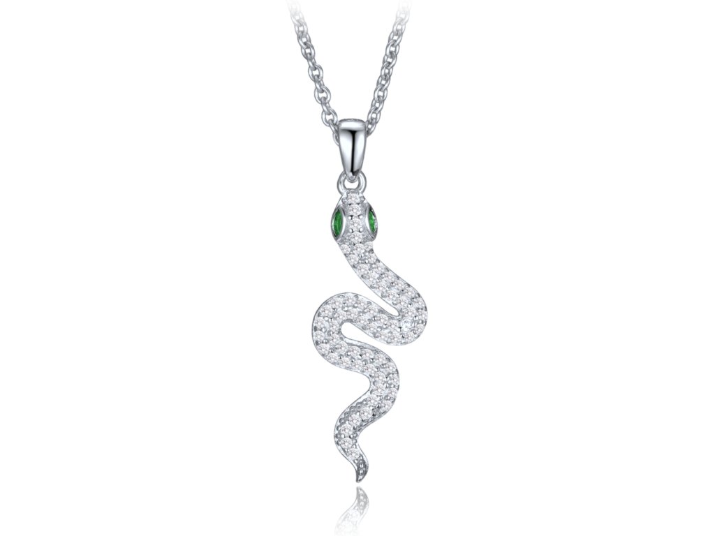 Náhrdelník MINET je vyroben z pravého rhodiovaného stříbra Ag 925/1000, které si dlouho udrží svou barvu i lesk. Přívěsek má motiv hada a zdobí ho bílé a zelené zirkony.