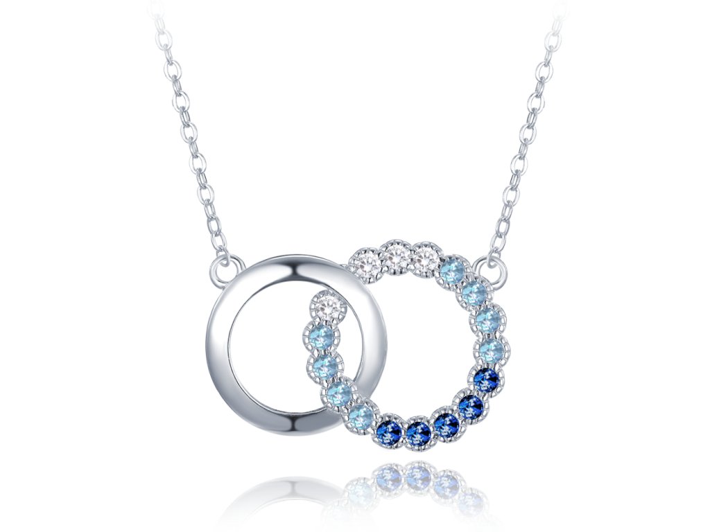 2143 MINET Stříbrný náhrdelník spojené kroužky s bílými a modrými zirkony