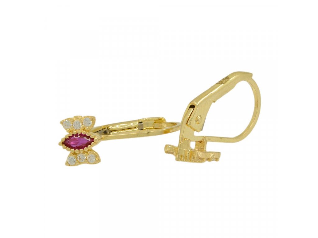 Náušnice jsou vyhotoveny z čtrnáctikarátového žlutého zlata s lesklou povrchovou úpravou. V náušnicích jsou vsazeny bílé a červené zirkony aby náušnice vynikly.