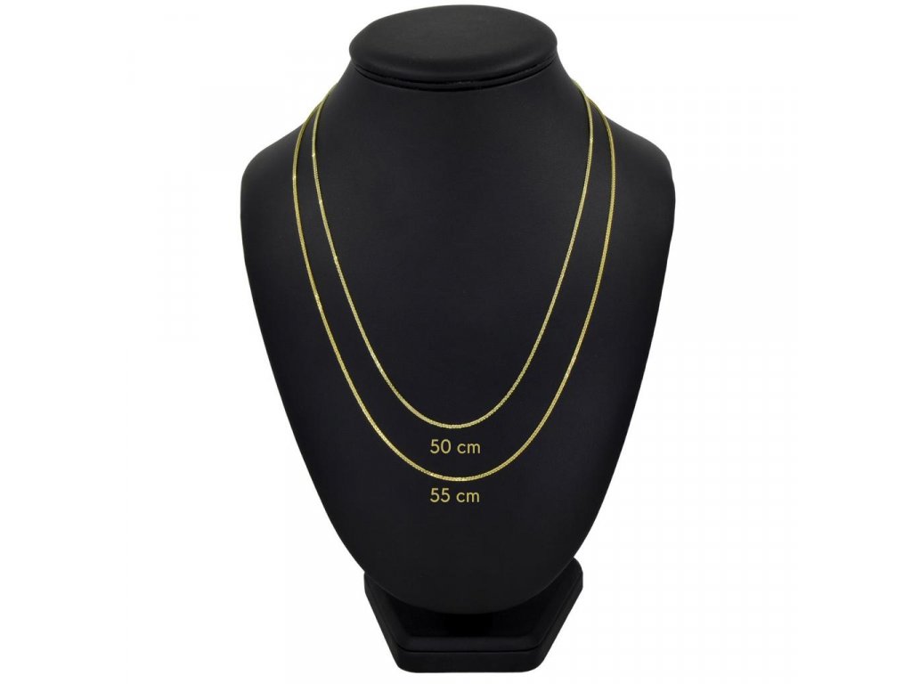 Řetízek ve vzoru Fox (liščí chvost) se šířkou vzoru 1,10 mm. Zapínání je na pérový kroužek (očko). Řetízek je vyroben ze žlutého čtrnáctikarátového zlata v diamantovém brusu s lesklou povrchovou úpravou. Díky svému provedení se úžasně hodí ke kombinaci s přívěskem ale lze jej nosit i bez přívěsku.