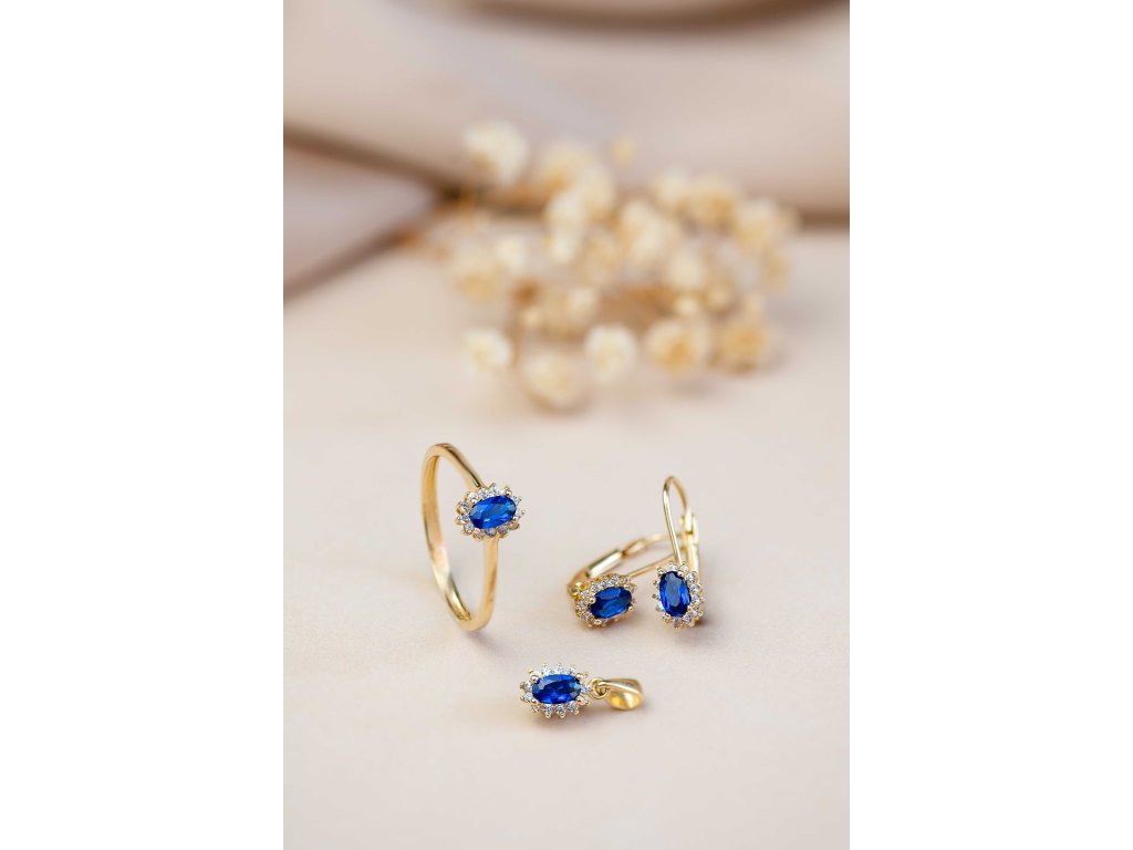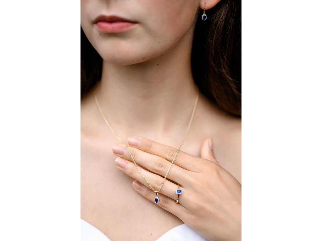Nádherná souprava z čtrnáctikarátového žlutého zlata v lesklé povrchové úpravě. Každá část soupravy je obohacena bílými zirkony a modrým zirkonem.